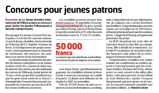 La JCI de Fribourg propose un nouveau concours, nommé Graines de Patron, Patronne, afin dinciter les jeunes fribourgeois à se lancer en tant quindépendant. Les projets doivent présenter des activités dans les domaines de lartisanat, des services, du commerce, de la restauration et doivent respecter des valeurs durables et/ou sociales.