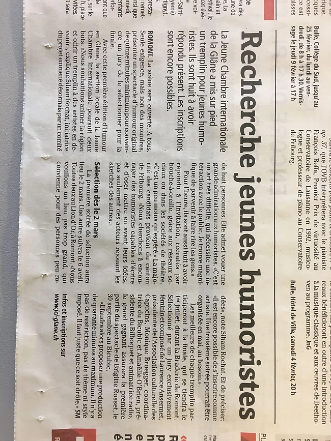 Humour en Glâne est un concept complètement nouveau dans notre région. C’est un concours scénique et artistique qui permet à des artistes non professionnels de présenter leurs productions originales au public et de concourir pour assurer la première partie d’un artiste connu dans la plus grande salle de spectacle de Romont (Le Bicubic, 450 places). Les prestations des 7 artistes (3 femmes (dont un duo) et 5 hommes) ont été jugées par un jury de professionnels du spectacle constitué de 3 personnalités locales, et par le public.