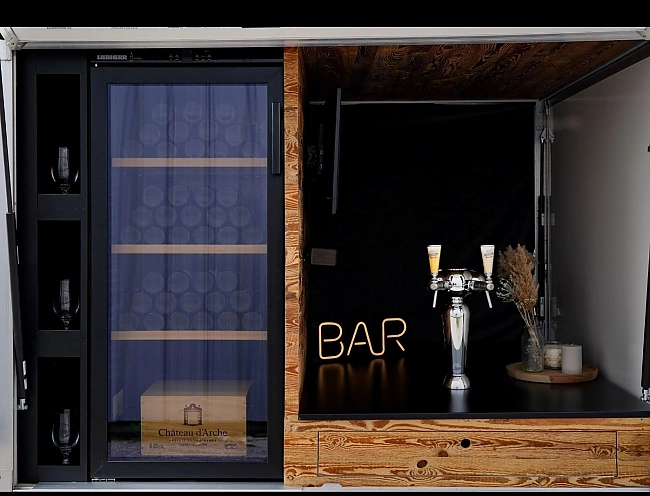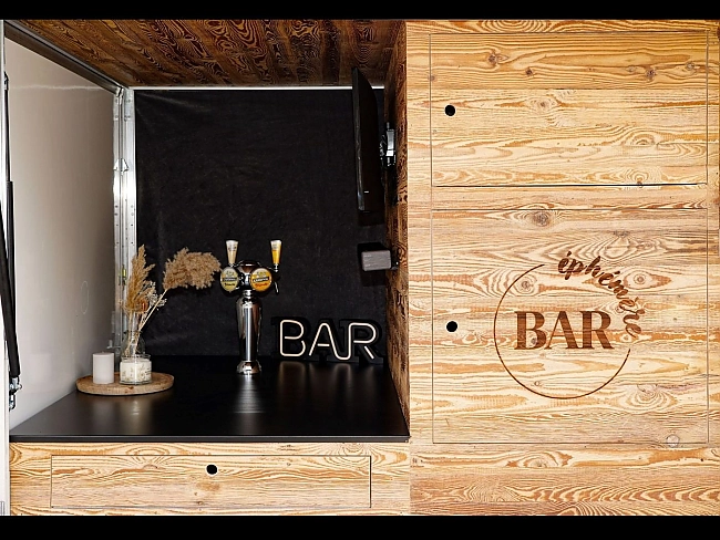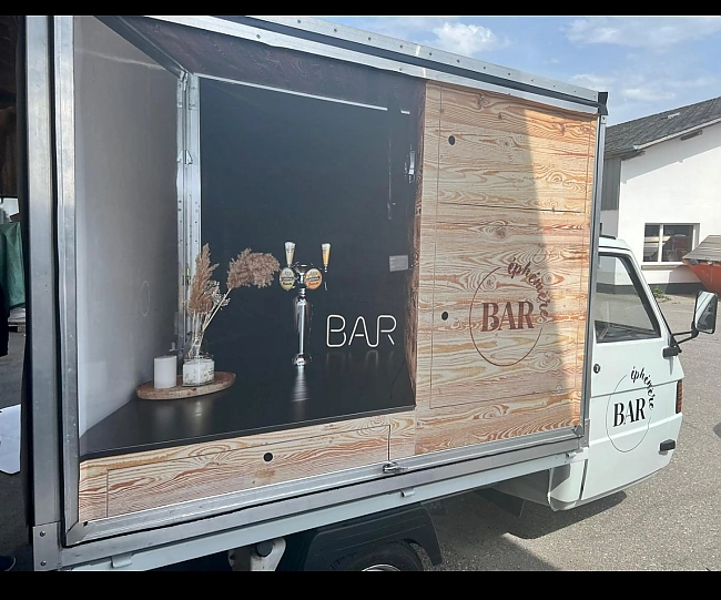 Diese Bar ist eine mobile Bar, die auf dem Chassis eines Piaggo APE aufgebaut wurde. Es verfügt über zwei Bierzapfanlagen, einen 122-Flaschen-Weinkeller für schöne Abende, einen Bildschirm und eine hochwertige Soundbar. Kurz gesagt, die perfekte Kombination, um bei Veranstaltungen aller Art eine tolle Zeit zu verbringen. Die Infrastruktur wird von Vereinen oder Wirtschaftsverbänden bereitgestellt vermietet an Personen, die an der Organisation von Veranstaltungen wie Geburtstagshochzeiten usw. interessiert sind.