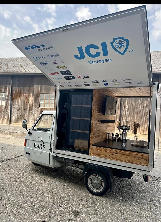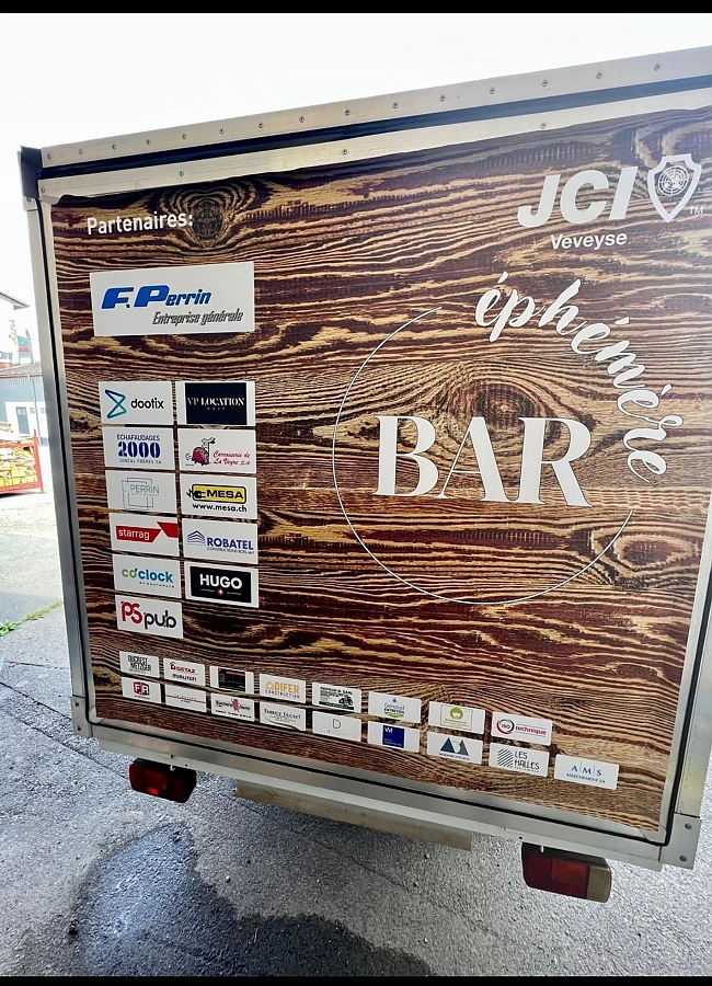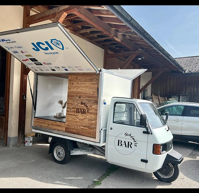 Le bar éphémère est un bar mobile qui a été construit sur le châssis d’un Piaggo APE. Il comporte deux tireuses à bière, une cave à vin de 122 bouteilles pour de belles soirées, un écran ainsi qu’une barre de son de haute qualité. En bref le combo parfait pour passer un excellent moment pour tous types d’évènements. L’infrastructure est mise à disposition d’associations, clubs ou entreprises ou louée à des particuliers intéressés à organiser des manifestations, tels que des mariages, anniversaires, etc.