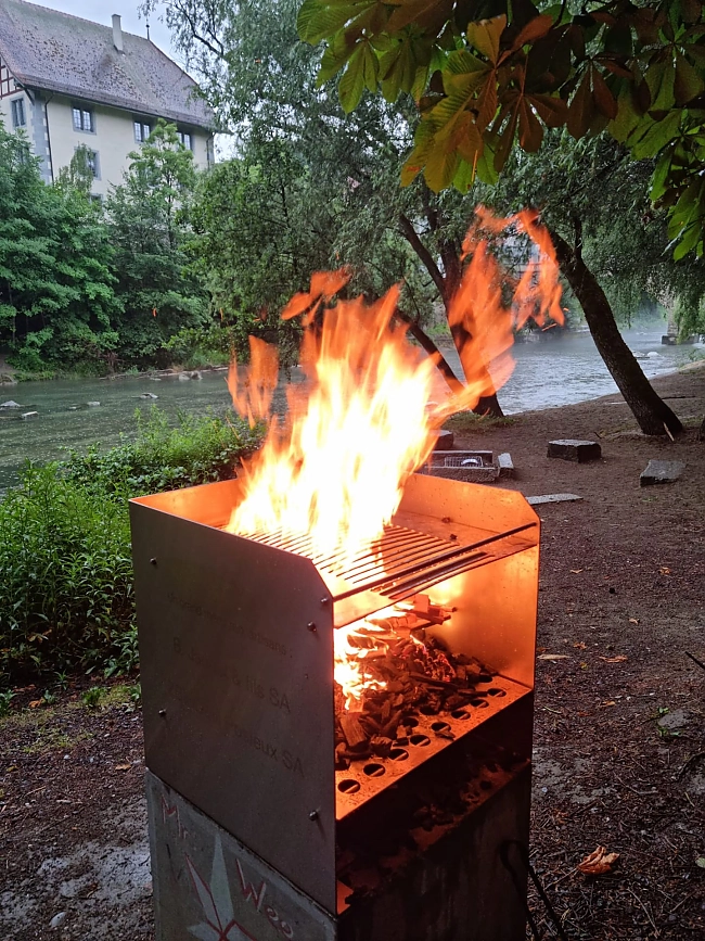 Ort: Am Ufer der Saane und im Zentrum der Freiburger Altstadt gelegen, ist der Standort des Grills ideal, um einen Moment der Entspannung in einer grünen Umgebung entlang des Flusses zu verbringen.