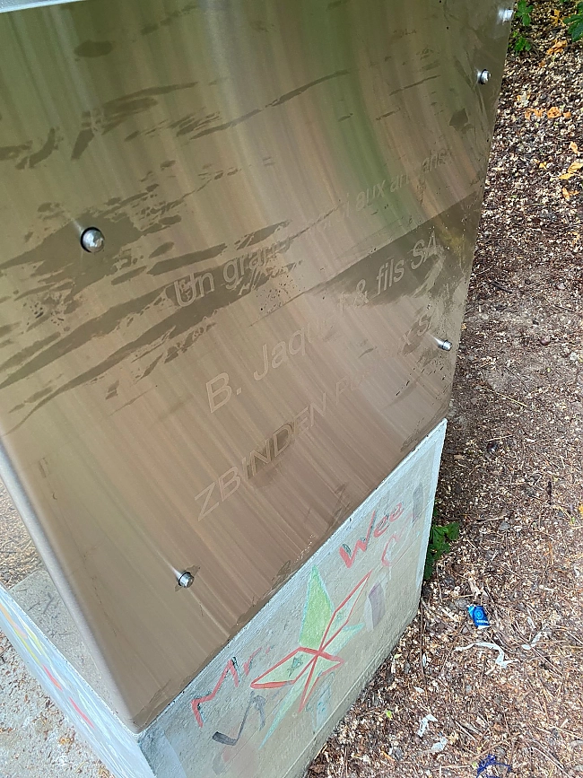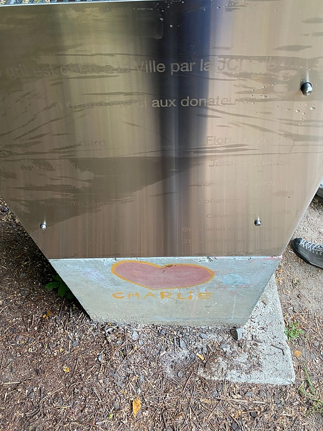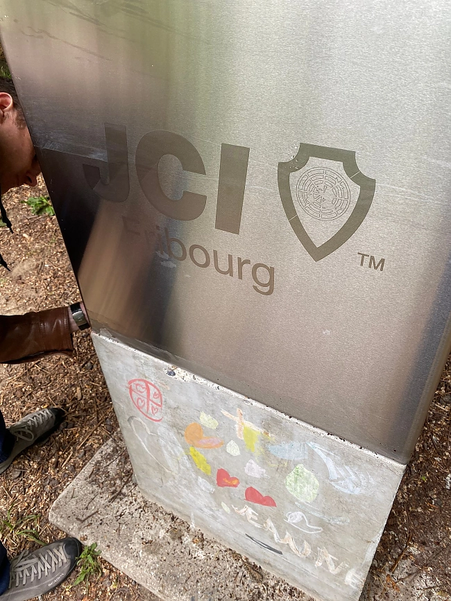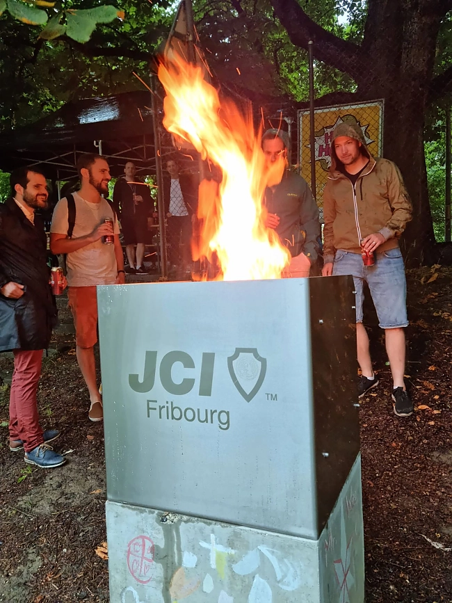 Spécificité : financement complet par les membres et la JCI Fribourg. Chaque membre ayant participé financièrement a vu son nom gravé au laser sur la structure du gril.