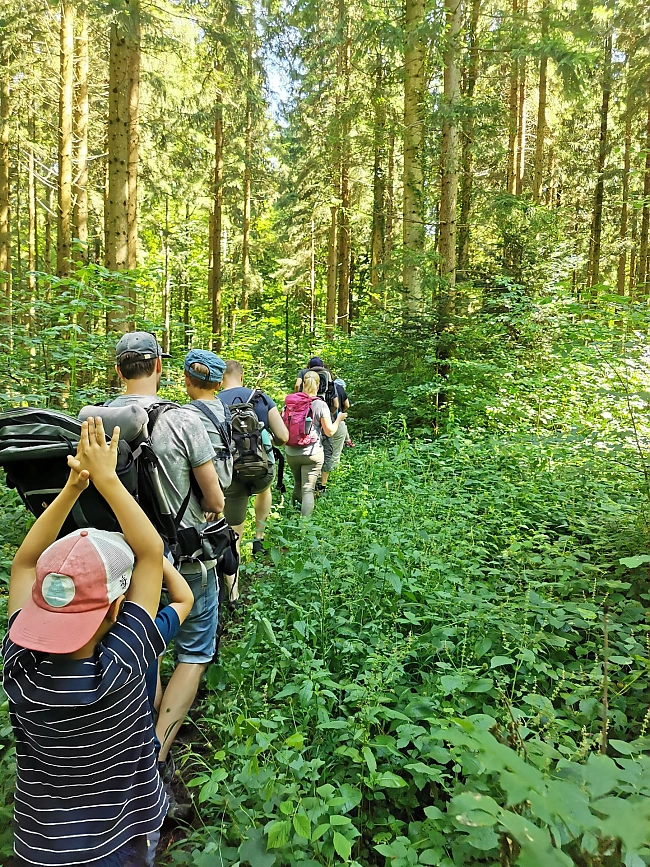 Die Wanderung führte von der Tobelbrücke durch den Inwilerwald und entlang der Oberallmig bergab zur Höllgrotte. Uns wurde auf dem Weg die älteste Wildkirsche des Kantons Zug gezeigt und viele weitere spannende Infos zum heimischen Wald. Zum Beispiel mit einem grossen Menschenkreiskreis wurde aufgezeigt, wie gross die Wurzeln der Bäume sind. Die Kinder sowie auch die Erwachsenen konnten vieles lernen über den Wald.