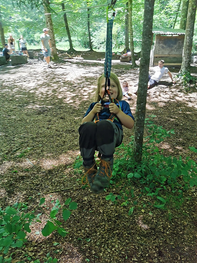 Nach gut einer Stunde Waldrundgang wurde über dem Feuer selbst Crêpes hergestellt und für die Kinder wurde eine selbstgebaute Seilbahn aufgebaut.