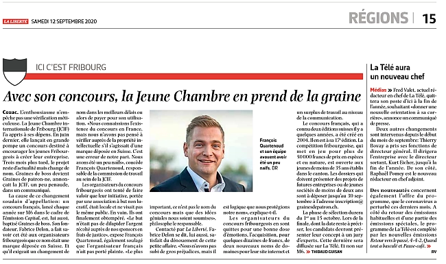 La JCI de Fribourg propose un nouveau concours, nommé Graines de Patron, Patronne, afin dinciter les jeunes fribourgeois à se lancer en tant quindépendant. Les projets doivent présenter des activités dans les domaines de lartisanat, des services, du commerce, de la restauration et doivent respecter des valeurs durables et/ou sociales.