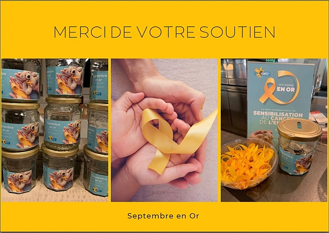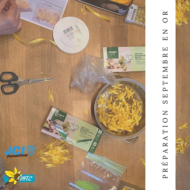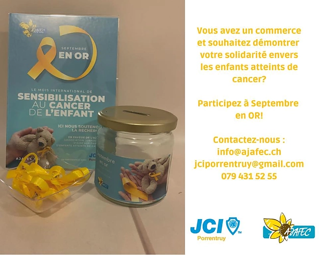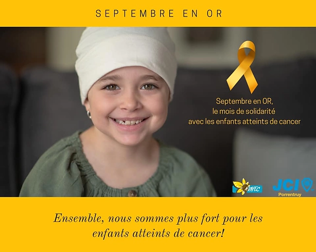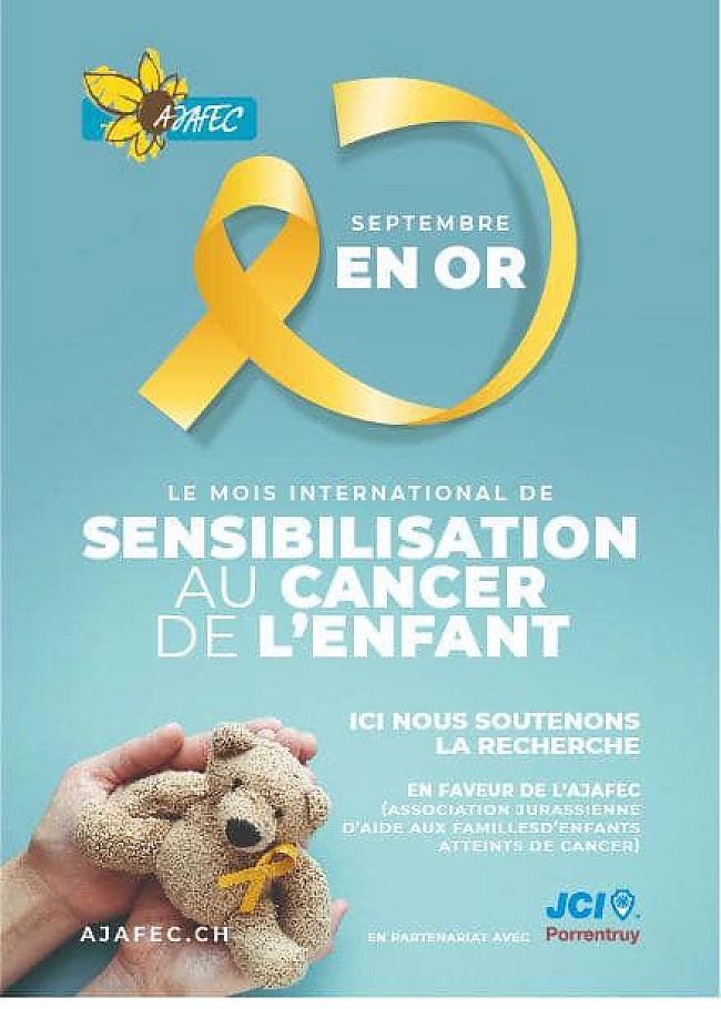 La sensibilisation au cancer de lenfant seffectue au niveau international, notamment au mois de septembre, par le biais de laction « Septembre en Or ». En 2021, la JCI Porrentruy a lancé un projet de récolte de fonds pour la recherche en oncologie pédiatrique, en collaboration avec lAJAFEC, une association jurassienne soutenant les familles dont un enfant est atteint de cancer. Un flyer explicatif ainsi, des tirelires personnalisées ainsi que 5'000 rubans dorés ont été réalisés. Ils ont été déposés dans près de 150 commerces locaux et stations-services du Jura et du Jura bernois et sont restés visibles durant tout mois de septembre.