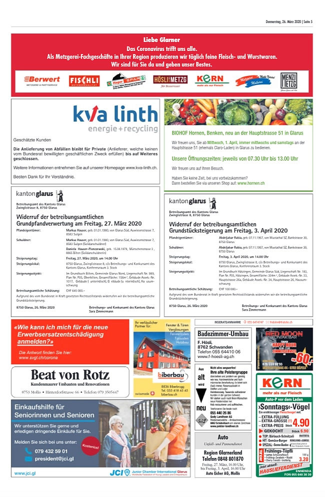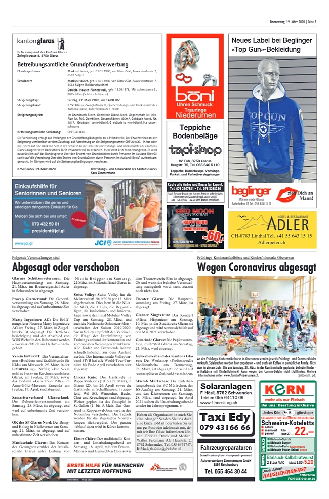 Dans le canton de Glaris, huit membres de la JCI, et d'autres bénévoles extérieurs au projet, ont travaillé chaque jour pour faire les courses pour des groupes à risque et notamment des personnes âgées. Ces dernières pouvaient s'inscrire via leur numéro de portable ou leur adresse électronique, après quoi un membre du groupe faisait les courses en question et les apportait directement chez la personne âgée (il va de soi que tout était gratuit). Tous les membres de la JCI ont fait montre d'un plein engagement et nous, à la JCI, d'une puissance en main-d'œuvre masculine et surtout féminine ! Les «clients » nous donnaient la liste de leurs courses soit directement par téléphone, soit par Whatsapp ou par courrier électronique.