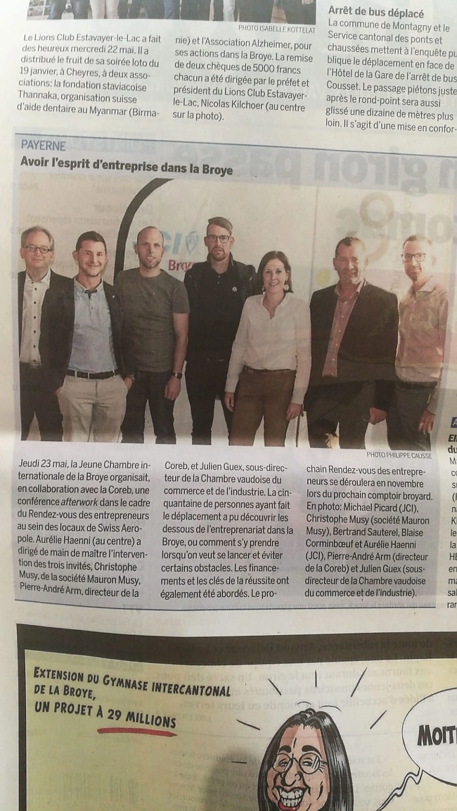 La Jeune Chambre Internationale de la Broye, en collaboration avec la COREB, à créé un site internet dédié entièrement au soutien des nouveaux entrepreneurs et met en place des afterworks sur des thèmes liés à l'entrepreneuriat.