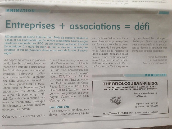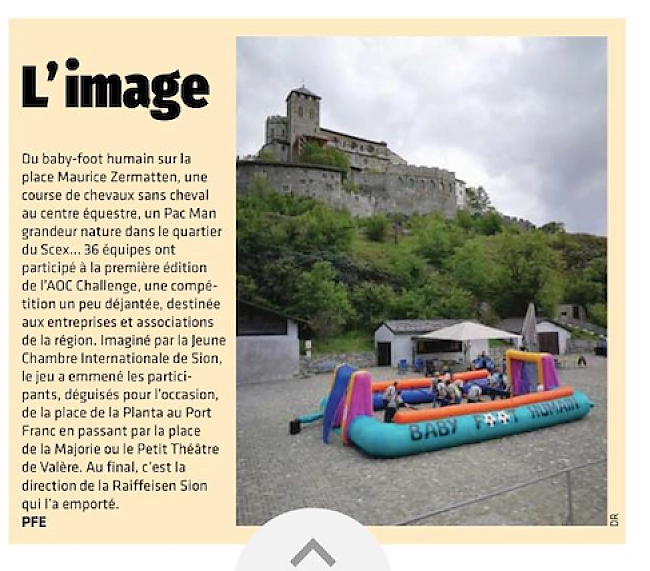 AOC-Sion est une compétition unique qui a permis aux entreprises et associations sédunoises de se rencontrer et de se mesurer les unes aux autres au cours de folles épreuves et de façon ludique, en plein coeur de la ville de Sion et dans des lieux insolites. Le parcours durait en moyenne 2 heures et la journée sest terminée par une soirée de réseautage, la proclamation des résultats et la remise de prix. LOffice du Tourisme reprendra le projet lannée prochaine.