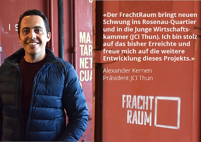 Der Grundstein zum FrachtRaum wurde im November 2017 gelegt. Mehrere Mitglieder der JCI Thun trafen sich zu einem 3-tägigen Workshop im Mobiliar Forum Thun. Ziel dieses Workshops war es, Ideen zu entwickeln, wie der Wirtschaftsstandort Thun und das Unternehmertum belebt werden können. Dabei entstand die Idee, ein Projekt rund um Pop Ups zu realisieren. Nach dem Workshop wurde das Projektteam ergänzt und die Ideen weiterentwickelt und konkretisiert. Einige Monate später konnte die Projektidee der Stadt Thun vorgestellt werden, welche ihre Unterstützung zusicherte und einen passenden Standort in der alten Post Logistik Halle zu verhältnismässig günstigen Konditionen zur Verfügung stellte. Nachdem die Finanzierung des Projekts dank der grossen Unterstützung von JCIS Senatoren gesichert war, wurde zwischen September 2018 und März 2019 die Halle in vielen Stunden Arbeit von den Mitgliedern von JCI Thun ausgeräumt, umgebaut und neu eingerichtet, damit der FrachtRaum am 1. April 2019 eröffnet werden konnte. Seither wird der FrachtRaum von JCI Mitgliedern sowie einem Betriebsleiter, welcher in einem 80% Pensum angestellt ist, betrieben.