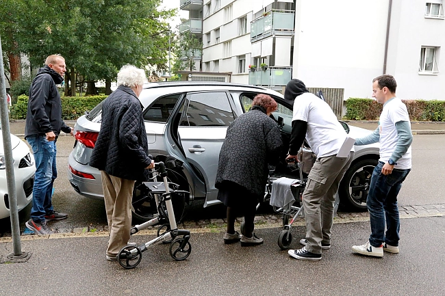 Mit der stattlichen Fahrzeugflotte von gut einem Dutzend Fahrzeugen (keines so schön wie mein damaliges Sportcoupé aber egal) ging’s zu den Bewohnern des Generationenhauses Neubad in Basel. In Zusammenarbeit mit den Pflegern des Hauses wurden die Betagten in die für sie jeweils präferierten Fahrzeuge verfrachtet und dann ging die Spritztour los. Ziel war es, dass die älteren Menschen nicht das Gefühl von einer Kaffeefahrt in einem Bus erhalten, bei der ihnen noch der neuste Rollator oder die tollste Rheumadecke aufgeschwatzt wird. Sondern eine ungezwungene Autofahrt die diesen Menschen das Gefühl verleiht, es sei wieder wie früher, als man sonntags mit der schmucken Familienkarrosse einen Ausflug zum nahegelegenen Fluss oder See unternahm. Es war tatsächlich genial feststellen zu dürfen, wie zufrieden und gut diese Idee durch die Senioren aufgenommen wurde. Sich endlich mal wieder in einer schicken Karre durch die Gegend kutschieren lassen und sich dabei frei und mobil fühlen zu dürfen. Dies an der Seite einer charmanten, gesprächsoffenen und höflichen jungen Begleitung (damit sind wir LOM-Mitglieder gemeint). Natürlich war die Ausfahrt für den einen oder anderen von uns auch eine Herausforderung und die Gespräche liefen nicht überall einwandfrei und reibungslos. Aber die Spritztour haben alle heil überstanden, was an sich schon zu einem Award berechtigt…. Unserer Meinung nach zumindest.