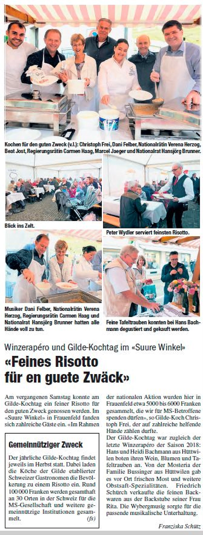 An diesem besonderen Tag schwang die JCI Frauenfeld mit namhaften Köchen und Persönlichkeiten aus dem Thurgau, mit viel Herzblut ihre Kochlöffel. Wer den Gilde-Kochtag besuchte, durfte sich über feines Risotto freuen und beim Schlemmen gleichzeitig Gutes tun: Der Erlös des Risottoessens ging zur Hälfe an die Schweizerische Multiple Sklerose Gesellschaft, um die Forschung im Bereich der Erkrankung voranzutreiben und das Engagement der Regionalgruppen zu unterstützen. Mit der anderen Hälfe der Einnahmen wurden weitere, an den jeweiligen Kochtag-Standorten lokal verankerte wohltätigte Institutionen berücksichtigt. Die Gilde darf auf ein über 20-jähriges Engagement für die Schweizerische Multiple Sklerose Gesellschaft zurückblicken. Auch viele der teilnehmenden Köche sind seit Jahren dabei und Kochen mit Leidenschaft und Herz für den guten Zweck.