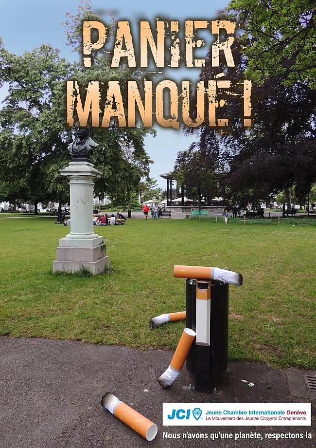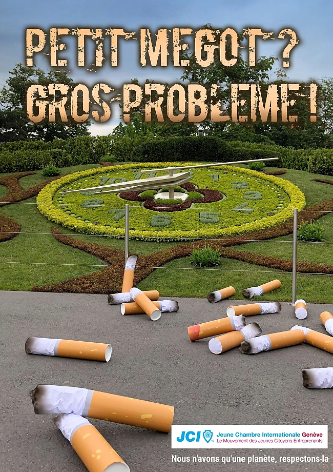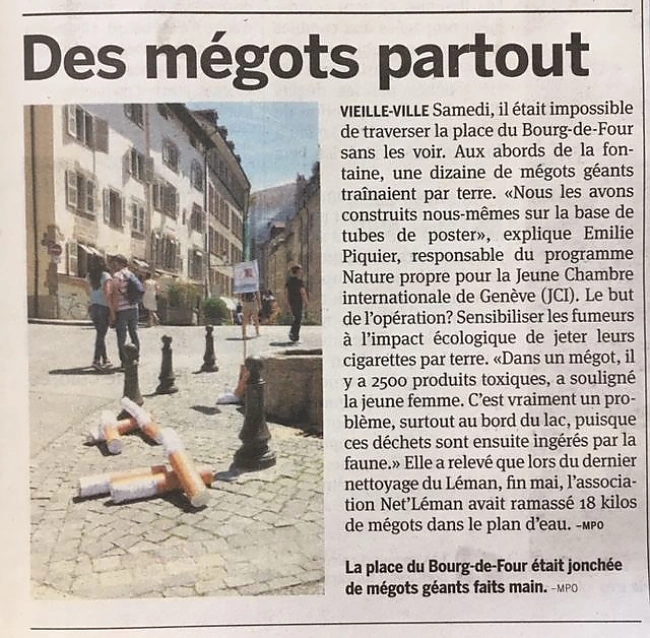 La JCI Genève a organisé en 2018 des journées de sensiblisation sur l'impact des mégots dans l'environnement. L'objectif était de communiquer sur les dangers du mégots jetés dans la nature et d'inciter les fumeurs et les jeunes générations à se débarasser des mégots dans les bons réceptacles.