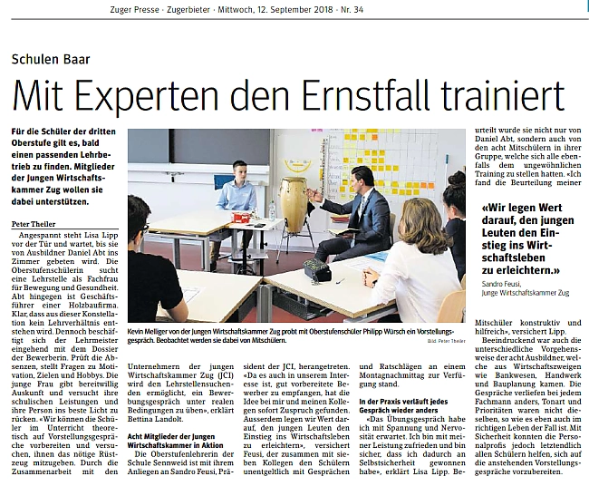 Wir, die JCI Zug, haben im Jahr 2018 und im Jahr 2019 in Oberstufenschulen im Kanton Zug ein Bewerbungscoaching durchgeführt. Wir erinnern uns alle noch an die Zeit als das Schüler- bzw. Studentenleben endete und es hiess : Bewerben-bewerben-bewerben. Warum also nicht unsere Ressourcen und unser Know-How zugunsten der Jugendlichen einsetzen? Zudem liegt eine tolle win-win Situation vor: Da sich die Jugendlichen im Raum Zug bewerben, erhalten wir einen Einblick in den interessanten Lehrlingspool 2019/2020. Das Hauptziel des Projektes betand darin, bei der Vorbereitung auf Bewerbungsgespräche einen Austausch zwischen den angehenden Lehrlingen und uns, den erfahrenen Berufsleuten und Jung-Unternehmern zu ermöglichen.
