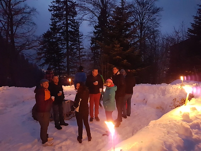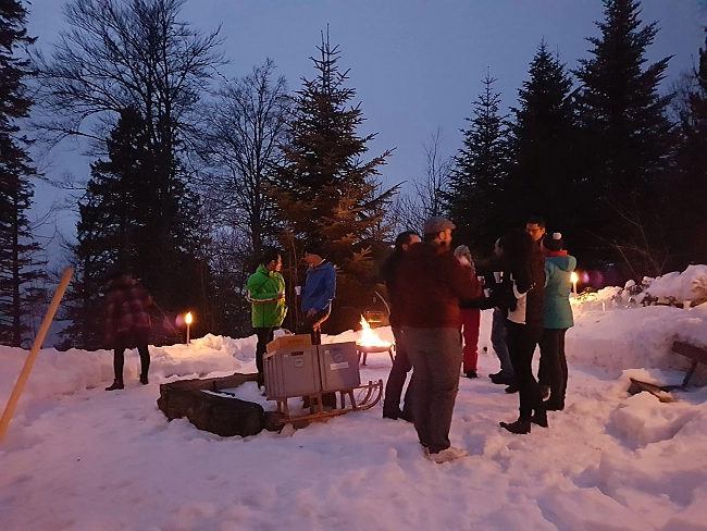 - Glühwein um das Feuer während des letzten Skiwochenendes am 26. Januar 2018 in Stoos