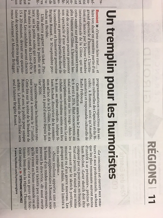Humour en Glâne est un concept complètement nouveau dans notre région. C’est un concours scénique et artistique qui permet à des artistes non professionnels de présenter leurs productions originales au public et de concourir pour assurer la première partie d’un artiste connu dans la plus grande salle de spectacle de Romont (Le Bicubic, 450 places). Les prestations des 7 artistes (3 femmes (dont un duo) et 5 hommes) ont été jugées par un jury de professionnels du spectacle constitué de 3 personnalités locales, et par le public.