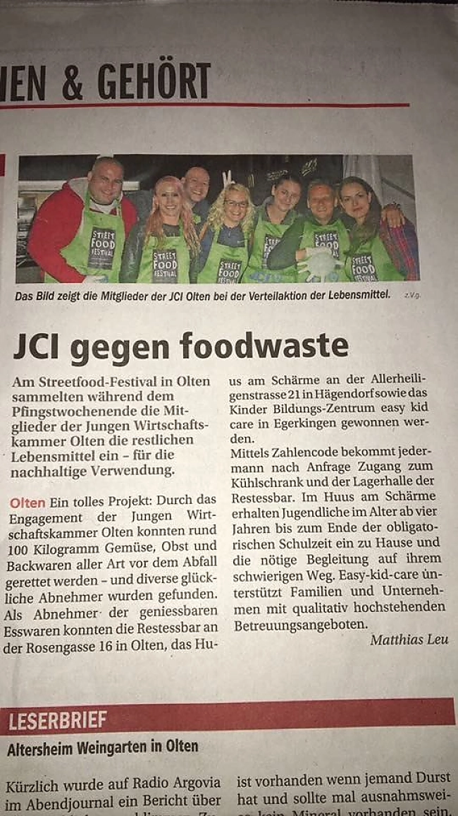Die renommierten Veranstalter Trend Fabrik und Hannibal-Events organisieren die grösste Streetfood-Festival Tour (SFF-Tour) der Schweiz mit rund 15 Austragungsorten und JCI Switzerland kann als offizieller Charity-Partner mitwirken. Gemeinsam wurde vor Ort auf die Problematiken betreffend «foodwaste» aufmerksam gemacht sowie die verwertbaren Essensreste eingesammelt und an Bedürftige und sonstige Organisationen verteilt.