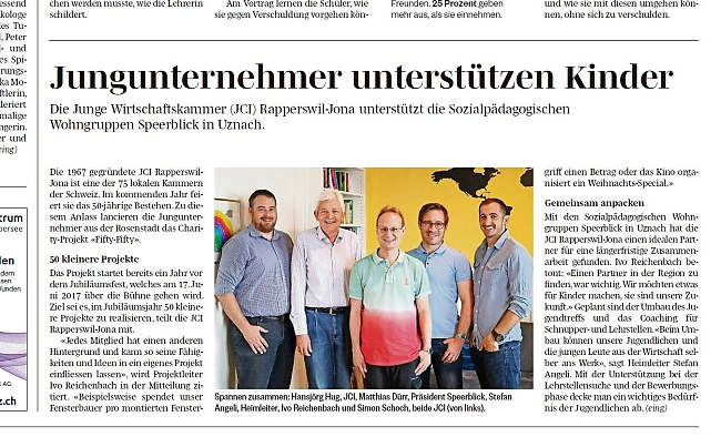 Die JCI Rapperswil-Jona feierte am 17. Juni 2017 ihr 50-jährigs Bestehen. Zum Jubiläum lancierte die LOM das Charity-Projekte Fifty-Fifty. Mit der Sozilapädagogischen Wohngruppe Speerblick in Uznach wurde ein idealer Partner für eine längerfristige Zusammenarbeit gefunden.