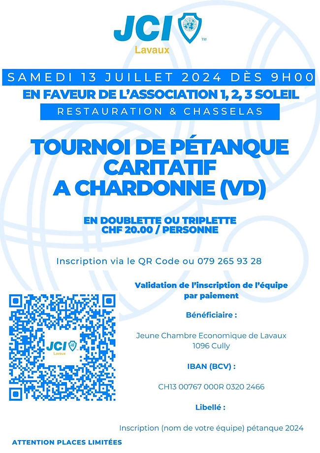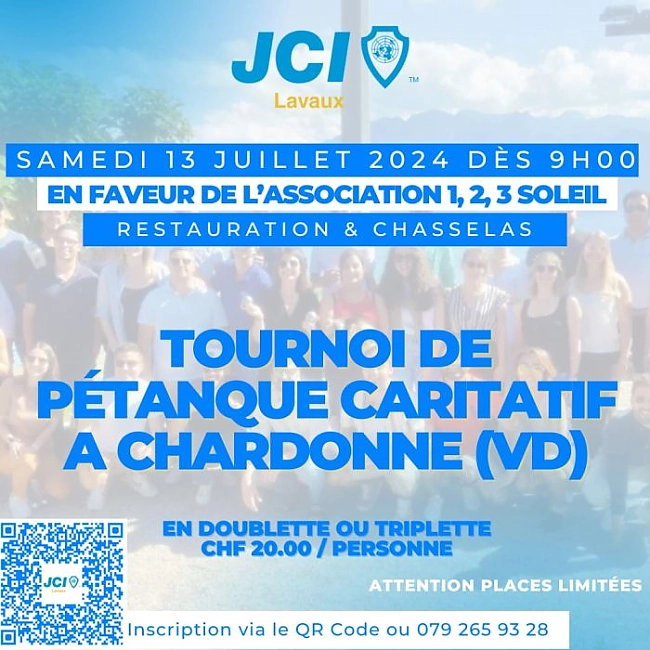 La deuxième édition de notre tournoi caritatif de pétanque a eu lieu dans un cadre exceptionnel, au cœur du vignoble de Lavaux, à Chardonne. Durant toute la journée, cet événement proposait une ambiance conviviale avec bar, restauration, musique et animations. Le jeu de pétanque, par essence un jeu d'équipe, a été le pivot autour duquel nous avons construit notre événement.